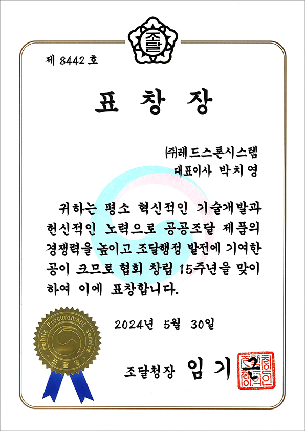 (주)레드스톤시스템이 정부조달컴퓨터협회 창립 15주년을 맞이하여 [조달청장 표창장]을 수여했습니다.